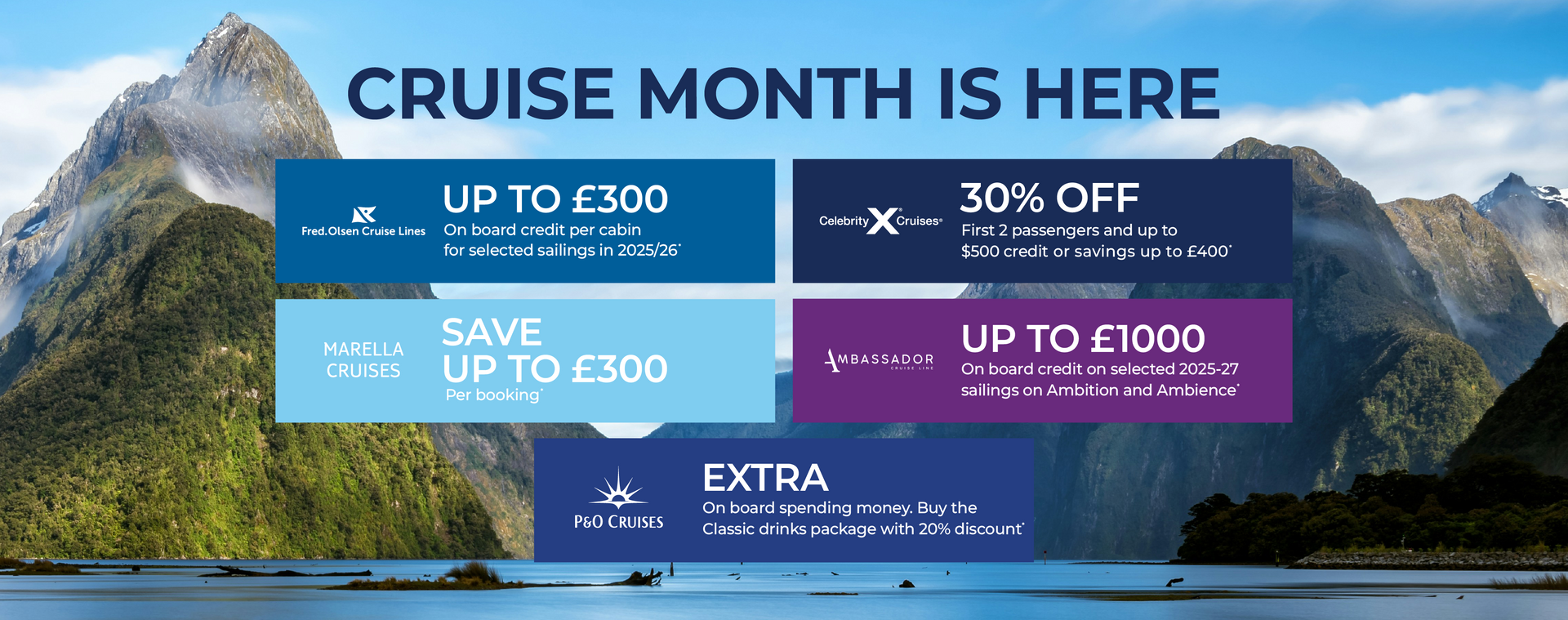 Onboard Credit Offer is valid on new bookings made from 0900 10th July closing 23.59, 31st August 2025 inclusive on selected Ambience and Ambition sailings departing between 25th August 2025 and 24th March 2027 only. Applicable on all twin cabin grades on both Ambience and Ambition, structured as sailings of 7-13 nights Inside £50 per cabin, Ocean View £150 per cabin, Balcony £200 per Cabin, Suites £250 per cabin. Sailings of 14-18 nights Inside £100 per cabin, Ocean View £250 per cabin, Balcony £400 per cabin, Suites £500 per cabin. Sailings of 19-30 nights Inside £150 per cabin, Ocean View £350 per cabin, Balcony £500 per cabin, Suites £750 per cabin and 31+ night sailings Inside £200 per cabin, Ocean View £450 per cabin, Balcony £750 per cabin, Suites £1000 per cabin. Single cabins receive 50% of the onboard credit value based on cabin booked and duration. Please note onboard credit is not applicable to sailings 6 nights or under, any festive/in port events, any Renaissance bookings or any booking made outside of the above dates and is only applicable to the lead booked guest and secondary guest (if applicable) in each cabin over the age of 18 and is not applicable to any 3rd /4th berth guest, or any child under 18 travelling.